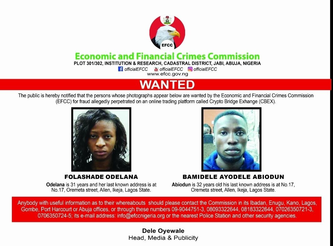 The Economic and Financial Crimes Commission (EFCC) has launched a manhunt for two Nigerian nationals Folashade Odelana and Bamidele Ayodele Abiodun over their alleged involvement in a major cryptocurrency fraud tied to the now-infamous Crypto Bridge Exchange (CBEX).