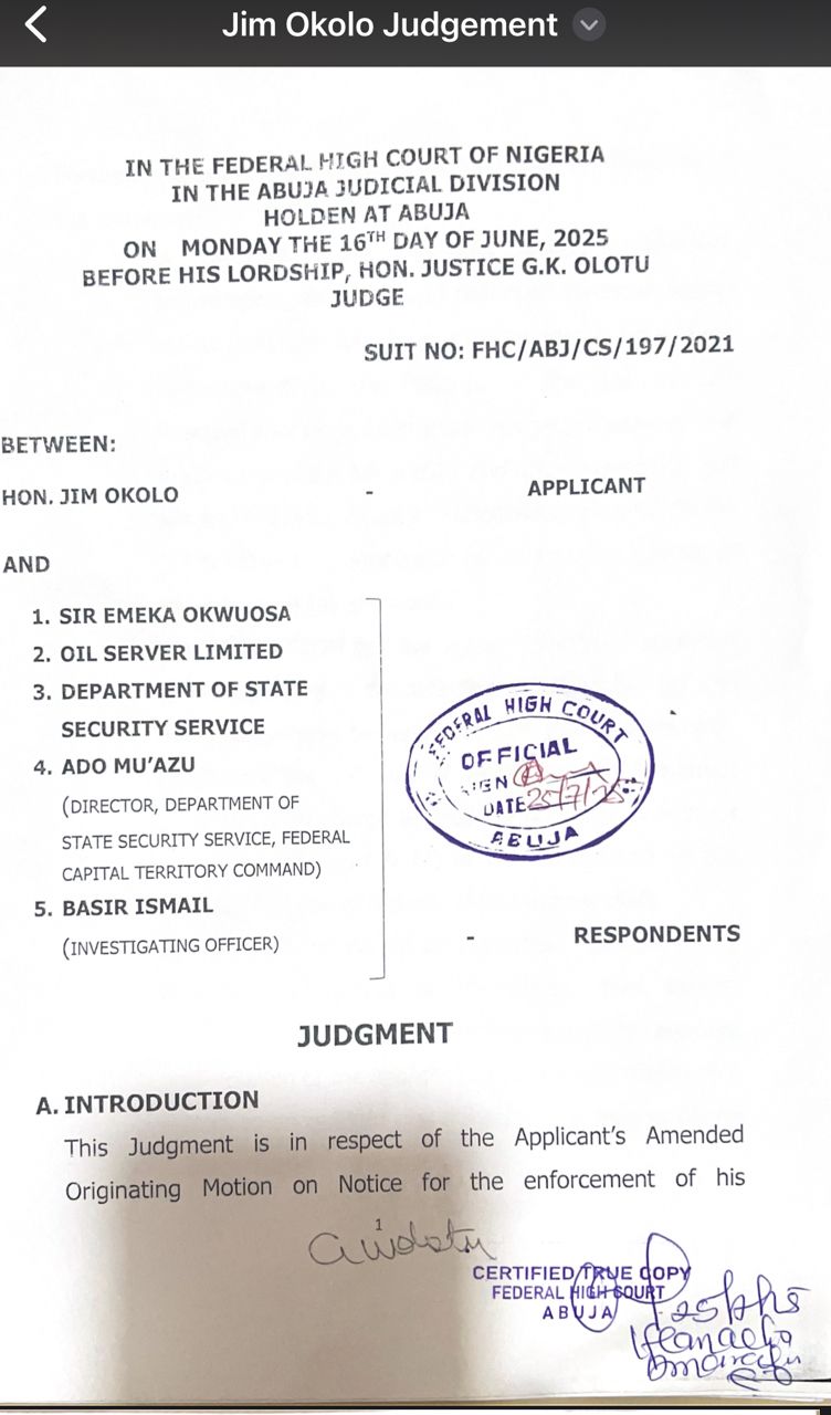 Chief Okolo is also facing prosecution in FRN v. Jim Okolo & 3 Ors. (Charge No: CR/109/22), before Justice S.U. Bature of the FCT High Court, Maitama, Abuja. The 17-count charge includes allegations of criminal intimidation, fabrication of evidence, giving false information to mislead public officers, and perjury.