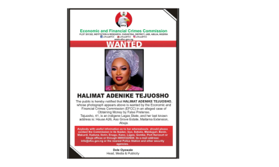 Nigeria’s anti-graft agency, the Economic and Financial Crimes Commission (EFCC), has declared a businesswoman, Halimat Adenike Tejuosho, wanted over an alleged case of obtaining money under...